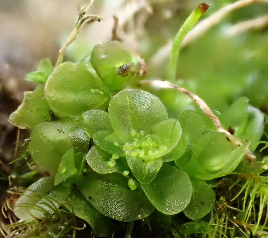 丸みのある葉がツバキの花のように重なり、その中心部には、緑色の粒々とした無性芽(むせいが)や胞子体(ほうしたい)をつけます。この無性芽と胞子を撒くこと、ちぎれた植物体が再生することでコケは増えていきます。崩壊地などは、不安定な環境であるため、イシヅチゴケは生長してすぐに無性芽や胞子を撒き、消失することが多いです。